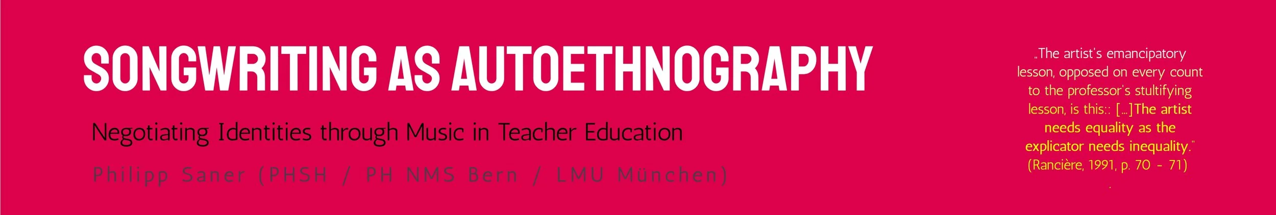 My dissertation project began with the extraordinary opportunity to create a research seminar in teacher education from scratch and without methodological boundaries. Inspired by the work of scholars such as Gouzouasis (2015), Bakan (2014) or Bartleet and Ellis (2009), I decided to introduce the student group to the methodology of arts-based autoethnography as a means of reflecting on their personal and professional becoming. "Songwriting as Autoethnography: Arts-based (Un-)learning in Teacher Education" took place over two semesters, beginning in September 2023 and ending in May 2024. 19 student teachers were involved and engaged in autobiographical writing, songwriting and critical reflection as they became part of a participatory, practice-based research project exploring the following guiding question: